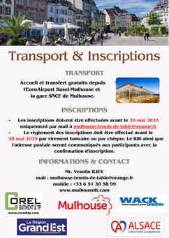 Ci-dessous, vous trouverez le règlement du tournoi, le flyer, ainsi que le formulaire d'inscription. Les inscriptions sont acceptées jusqu'au 20 mai 2025 à l'adresse e-mail suivante : mulhouse-tennis-de-table@orange.fr. Toutes les informations complémentaires, ainsi que les résultats de l’édition 2025, seront disponibles sur notre site web : www.mulhousett.com.
